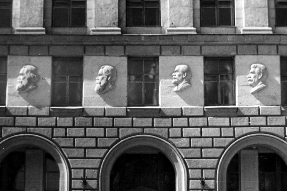 Изначально четыре профиля вождей находились на фасаде здания, так как изначально оно было построено для Сталинградской партийной школы в 1953 году. С 1960 года здание было передано медицинскому университету.